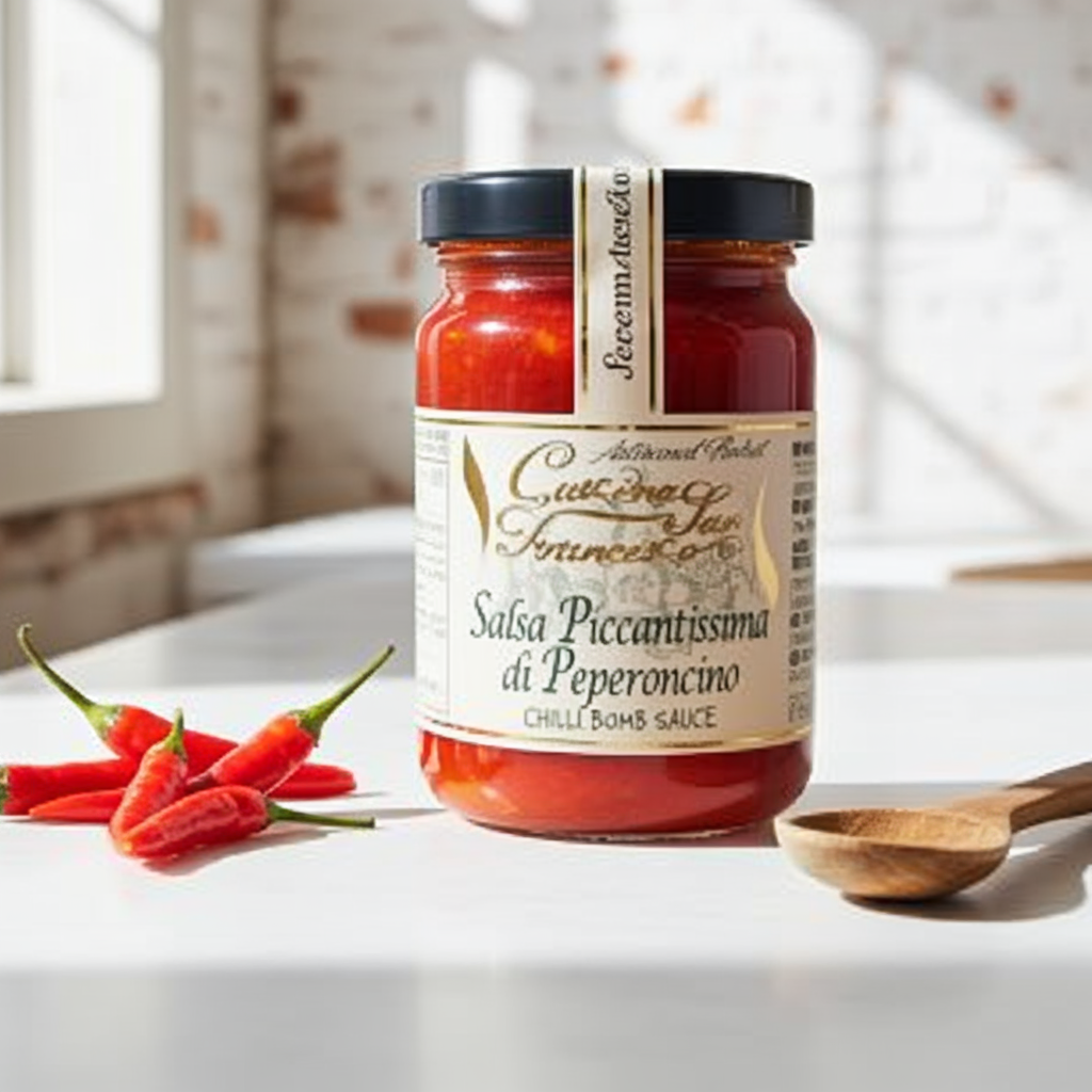Aus einer Auswahl von zwei sehr scharfen Chilischoten und hochwertigem Olivenöl entsteht diese köstliche Sauce, die perfekt zu Pasta und Fleischgerichten passt. Das Produkt wird anschliessend in Gläser abgefüllt, pasteurisiert.